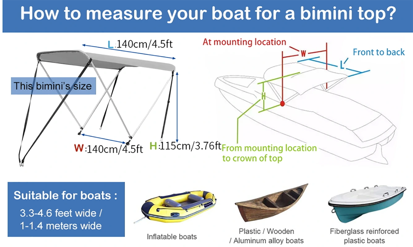 Canopy na gawa sa 210D oxford cloth, moistureproof, rain-proof. 210D marine grade material Ang Bimini top ay isang multi-functional na sunshade canopy para sa dagat na kayang labanan ang init ng araw at panatilihin ka at ang iyong pamilya para ma-enjoy mo ang ligtas na komportable at libreng karanasan sa dagat.