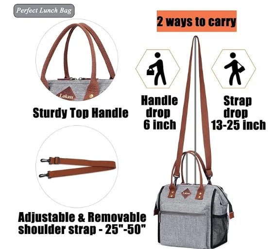 Ang malaking bag ng tanghalian ay may pangunahing kompartimento (10.5 "x6" x12 "), isang malaking front zipper bulsa (8" x7 "x1.5"), isang bulsa sa likod (9.5 "x6.5") at 2 side mesh bulsa. Nangungunang mga hawakan at nababagay at naaalis na strap ng balikat (25 "-50") na disenyo para sa madaling dalhin.