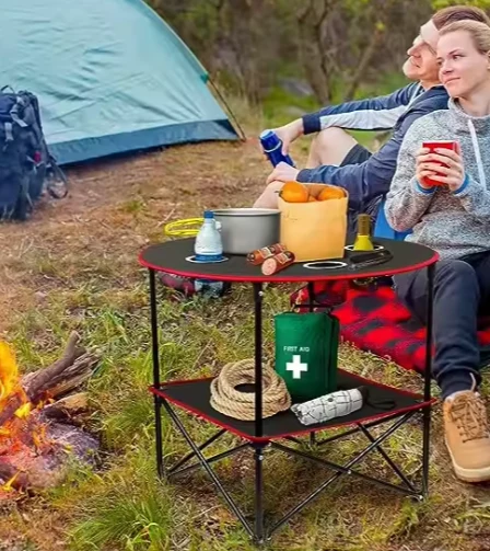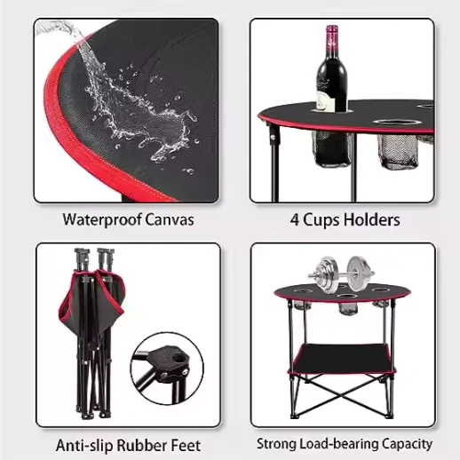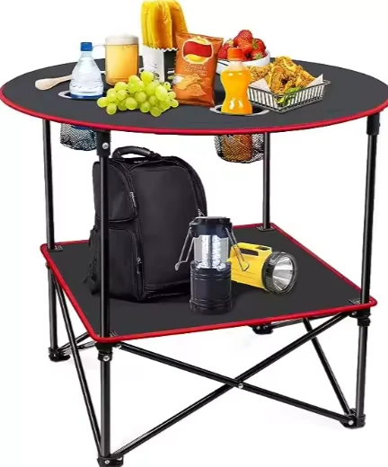 Panlabas na hapag -kainan sa beach. Ang mga nakatiklop na square canvas table ay hindi lamang maaaring magamit sa loob ng bahay kundi pati na rin para sa kamping, pangingisda, hiking, beach, piknik, bbq, cooking.zhejiang jiayu panlabas na mga produkto Co, Ltd., gitna para sa isang mangkok ng popcorn, chips, dip o iba pang meryenda , mga susi, atbp, na ginagawang mas madali at mas malinis ang mga aktibidad sa labas. Sa tuktok na antas ng talahanayan, mayroong isa pang tier para sa labis na puwang upang hawakan ang pagkain.