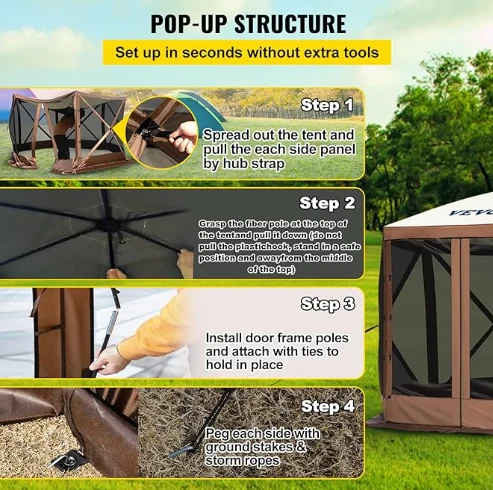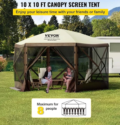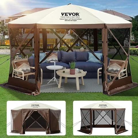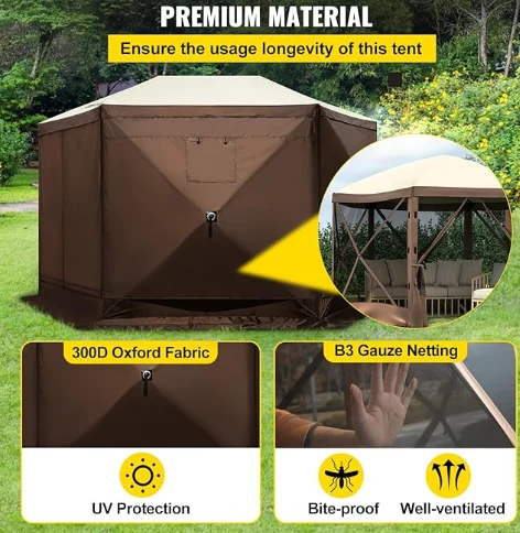Rainproof Pergola Camping Canopy Tent, ang Camping Gazebo Tent ay gawa sa 300D Oxford Tela at B3 Gauze Netting. Ito ay hindi tinatagusan ng tubig ng IPX3, kagat-proof, at UV-proof. Ang 12 'x 12' gazebo canopy ay nagbibigay ng isang malaking puwang para sa paggamit ng panlabas na kanlungan.